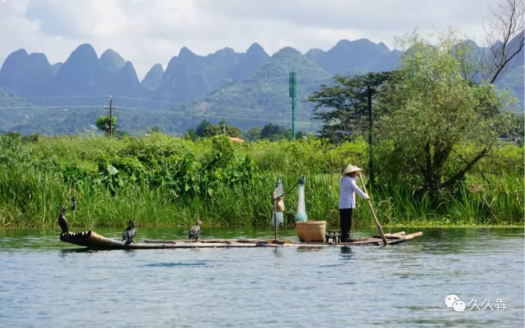 下午我們又來(lái)到了漓江邊上,漓江正是看桂林山水的好地方。乘坐在竹排之上游覽漓江山水無(wú)疑是一種享受。放眼望去,群山環(huán)抱,高低起伏,連綿不絕,大自然的懷抱使人塵慮盡滌,俗念頓消。從導游口中還得知從桂林到陽(yáng)朔的83公里是漓江的精華,有“百里漓江,百里畫(huà)廊”之稱(chēng)。這里的山光水色交相輝映,集山青,水秀,洞奇,石美于一體,我們隨著(zhù)竹排緩緩觀(guān)景,就好象在我們游船的兩岸徐徐打開(kāi)了山水畫(huà)的長(cháng)軸,沿途景致,美不勝收。群山當中有幾座山甚為特別,山體的形狀像奔騰的駿馬,導游說(shuō)這是漓江著(zhù)名景觀(guān)之一“九馬畫(huà)山”,因山有九匹駿馬的形狀而得名,那畫(huà)山又是什么意思呢?畫(huà)山是因為山壁如削,遠望如一幅巨大的畫(huà)屏,高、闊各一百多米。石壁上朱、黃、綠、白,五彩斑斕,濃淡相間,班駁有致,宛若巨幅壁畫(huà),因而叫畫(huà)山。整個(gè)游江行令人有"舟行碧波上,人在畫(huà)中游"之感。